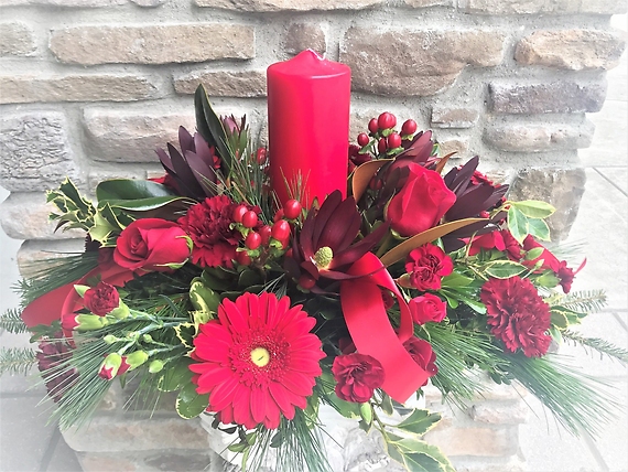 Share peace and joy with everyone you love. Candlelight tops the holiday's finest roses, Gerbera daisies, safari sunset, carnations seasonal trim and fragrant greens.